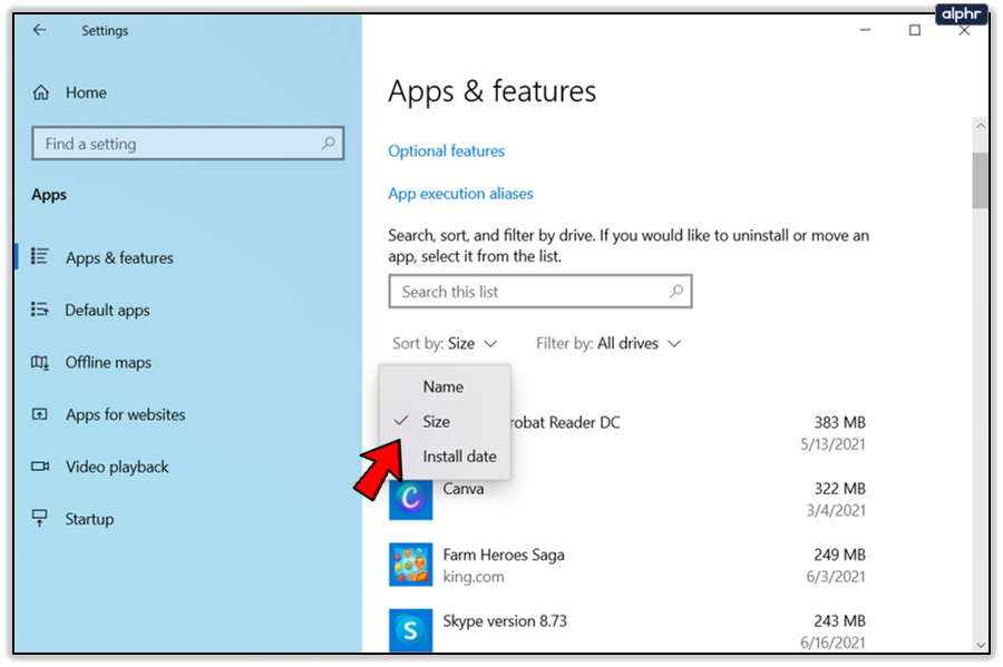 - Select Sort by: at the top of the list and select Size instead of Name.