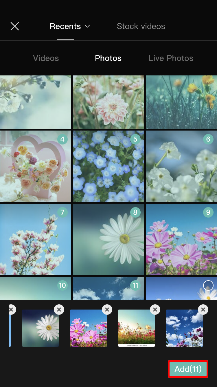 - Choose 11 photos from your gallery and select “Add.” Keep in mind that they should be uploaded in the order you want them to appear in the video.