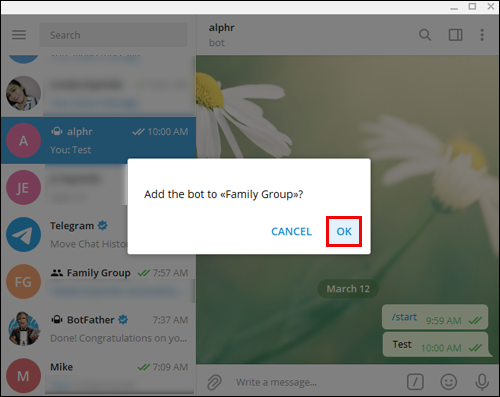 - Select the group/channel you wish to add the bot to.