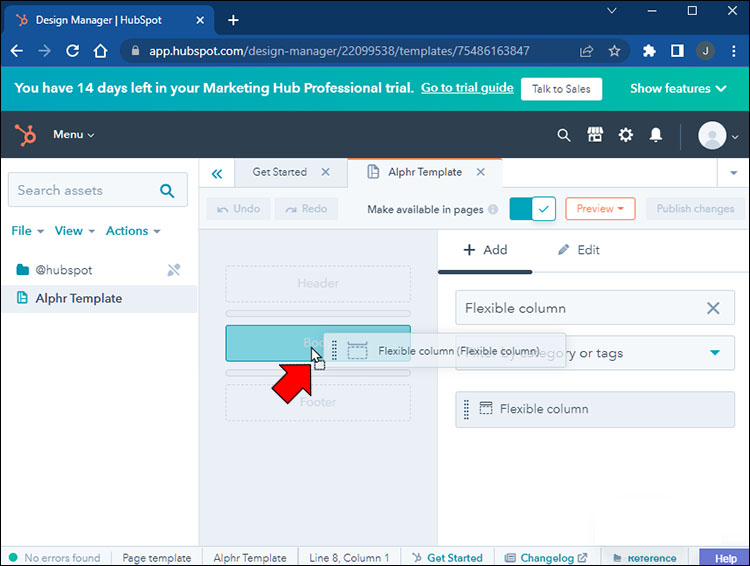 To add a flexible column in HubSpot, go to the “Layout Inspector” and “Flexible Column.” Drag and drop it into the template to add it.
