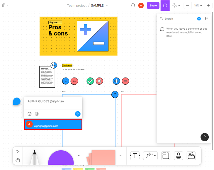 If the collaborator you want to mention is missing from the list, it’s probably due to Figma’s commenting restrictions. Namely, there are some restrictions on who you can mention when working in a team. If you’re a team member, you can mention: