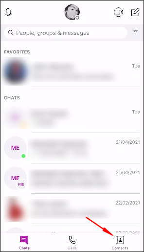 - Select the “Contacts” tab found at the bottom of the screen. Your contacts will be listed alphabetically.