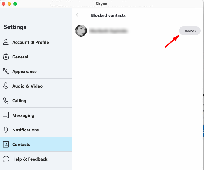 To unblock a Skype contact: