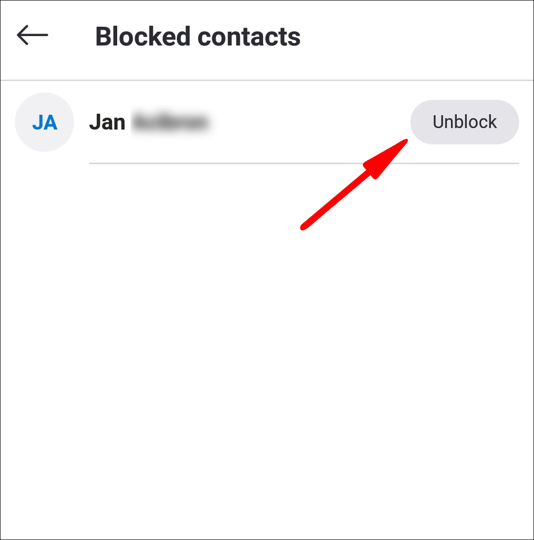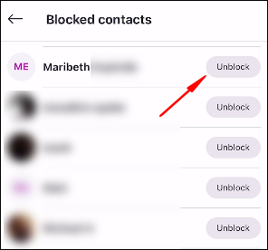 - Next to the contact you want to unblock, select “Unblock.”