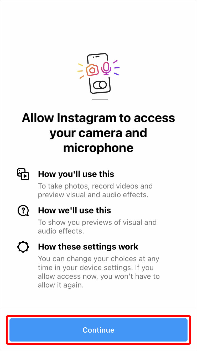 - If you haven’t already, grant Instagram access to your camera.