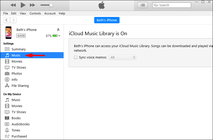 - Under the tabs, select “Sync Music Onto Your Device.”