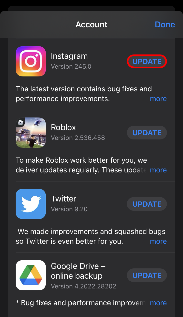 Attempting to use an outdated Instagram app may result in glitches. If you’re on iOS, go to the Apple App Store and update your app manually. The same goes for Android users, though they’ll use the Google Play Store instead.