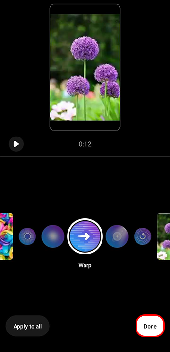 - Once you choose, you can click “Done” or “Apply to all” if you want the same transition between all clips.