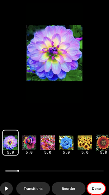 - You can add one type of transition between all clips by choosing a transition and clicking “Apply to all,” or click “Done” if you want to put a different style for each transition.