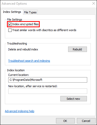 - Check the box marked “Index encrypted files.”
