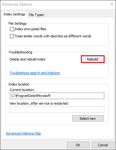 - The “Index Location” section under it will allow you to choose where the new files are indexed.