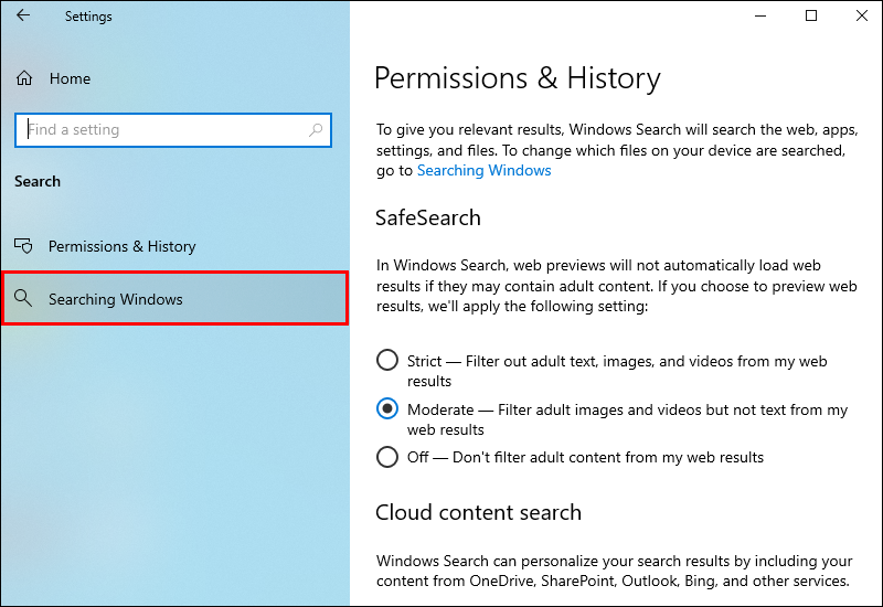 - Navigate to the “Search” category and select “Searching Windows.”