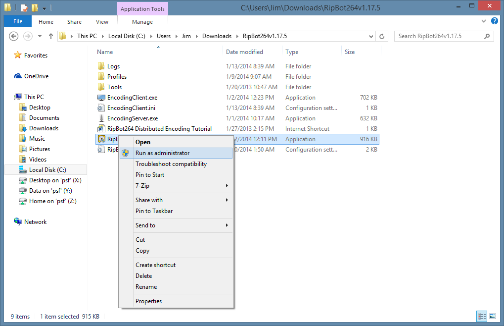 If you want all instances of a particular app to run in administrator mode, you can change the app’s compatibility settings. Navigate to the location on your hard drive where the application is installed (usually located in the applicable subfolder of the Program Files directory). Find the app’s primary executable. In our example, we’re using the video conversion software RipBot264, and its executable is RipBot264.exe.