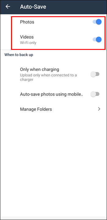 - Turn on the “Photos” toggle switch. If you want to autosave videos, turn on the “Video” toggle switch.