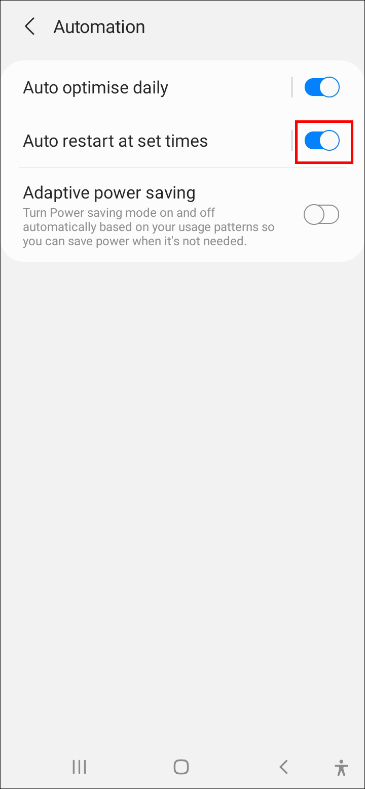 Some phone brands, such as Samsung, have an auto-restart feature as part of their device settings. While this feature is there to help extend the life of your device, if it ever glitches, it can cause the phone to restart when it shouldn’t.