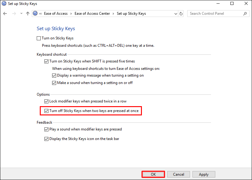 - Uncheck the “Turn on Sticky Keys” option, then click “OK.”