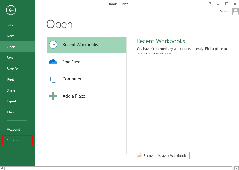 - Select the “File” menu, then choose “Options” from the left sidebar.