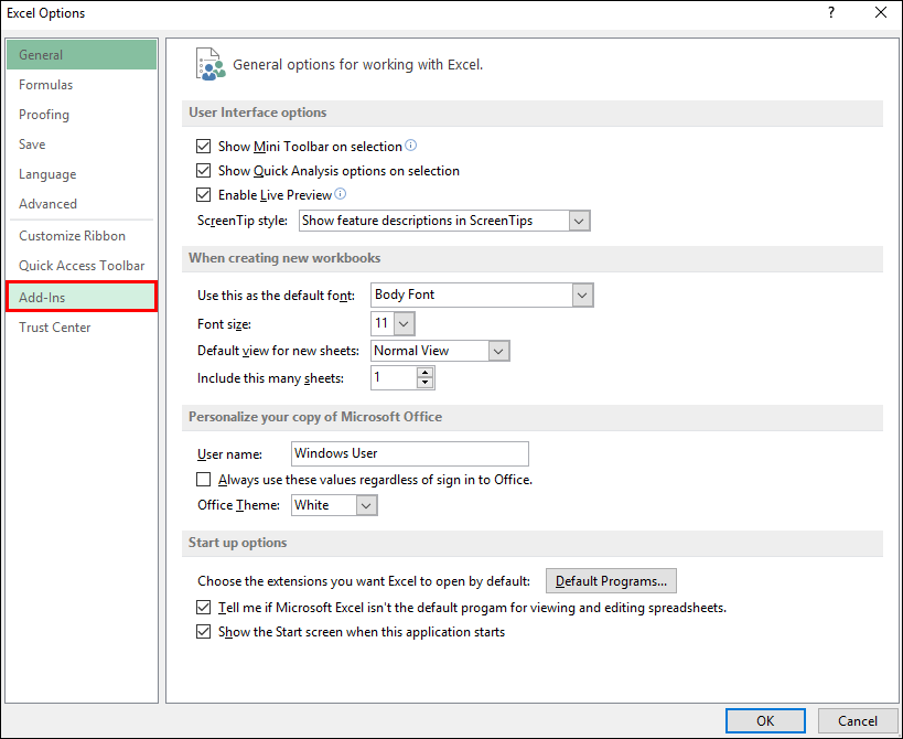Either try disabling recently added add-ins in Excel or disable them all, as it’s possible that an add-in could be conflicting with Excel. Here’s how to disable your Excel add-ins: