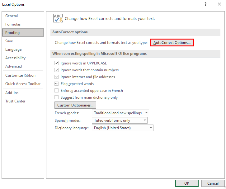 - On the left side of the “Excel Options” dialog, select “Proofing.”