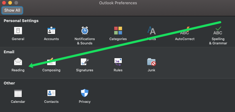 - Under the ‘Email’ section click on ‘Reading.’
