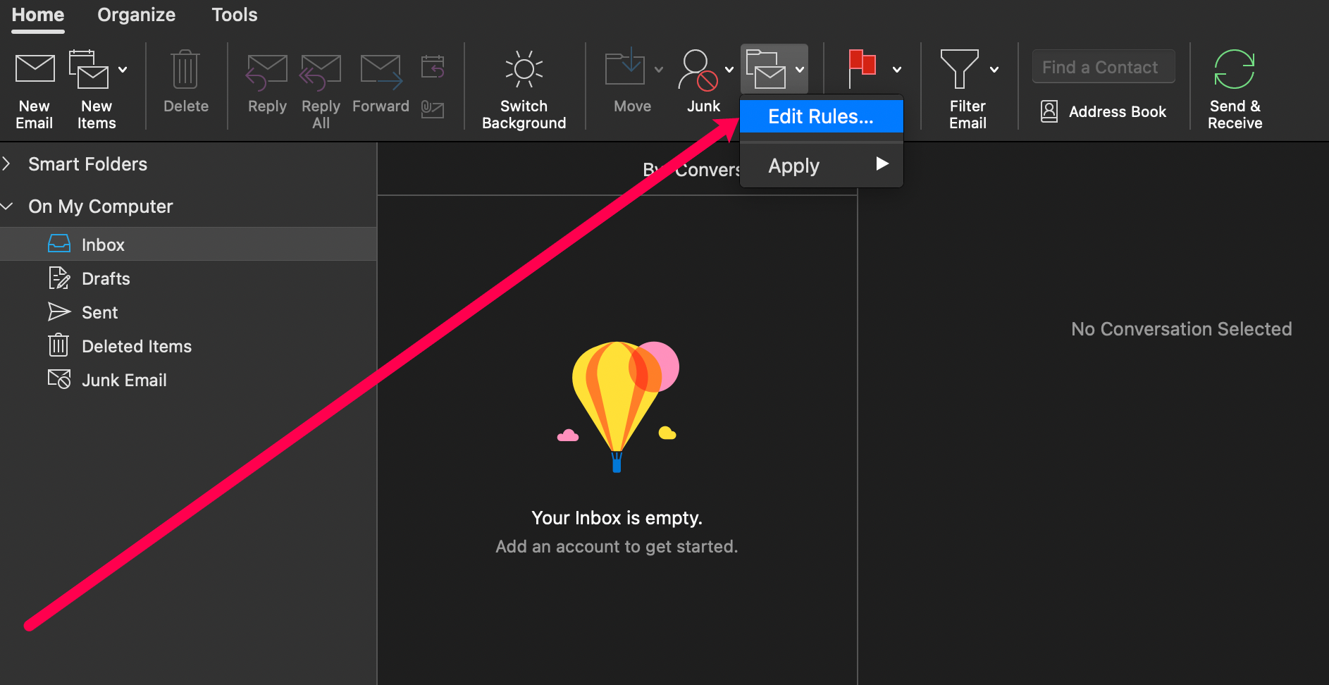 - Click on the + symbol at the bottom. PC users may see Inbox rules, select that, then select New.