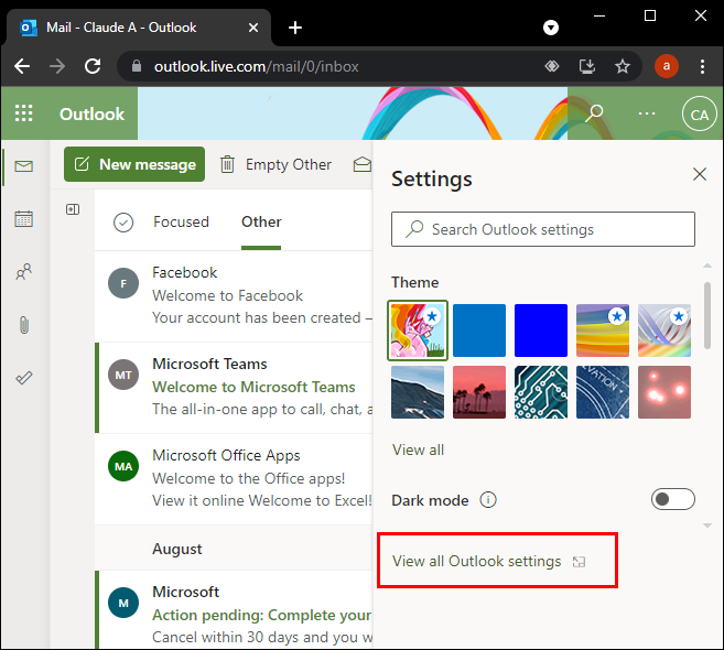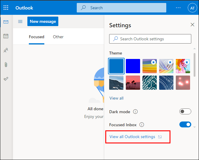 - Select “Settings” located at the top of the page and then “View all Outlook Settings.”