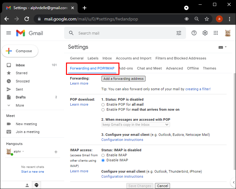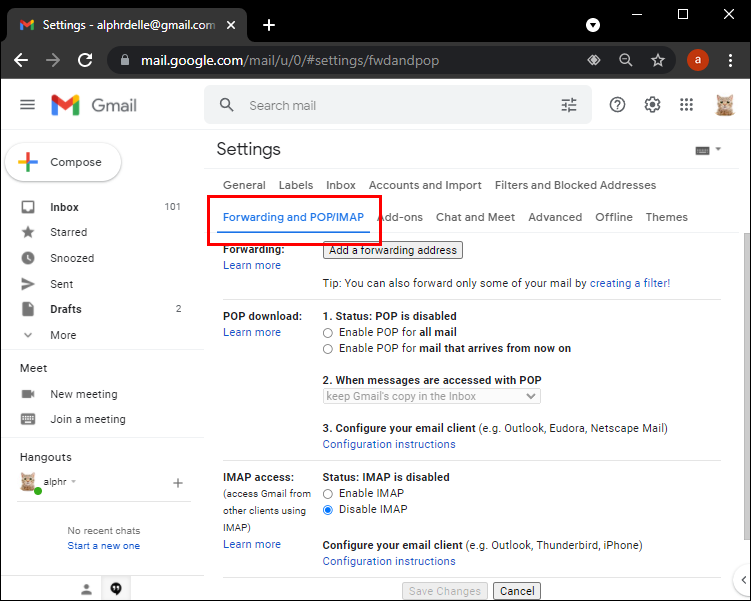 - Click “Settings,” then, “Forwarding and POP/IMAP”.