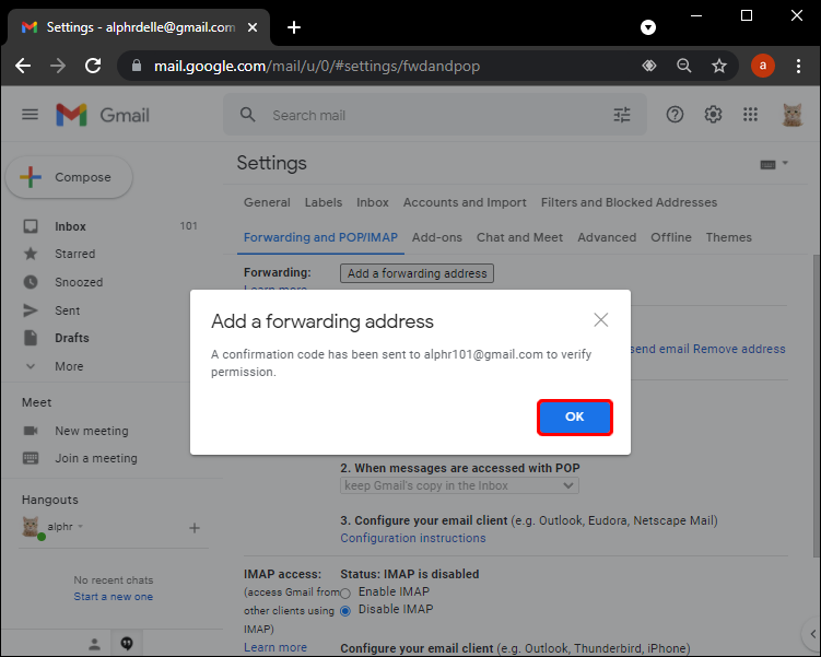 - Google will then send a confirmation message to the email address. Copy the confirmation code next to where it says “Verify” in “Forwarding and POP/IMAP.”