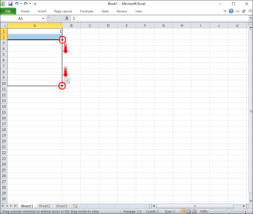 - Once a number has been assigned to the selected cell, hover the cursor over the drag handle in the bottom left corner, and drag it down to the last cell in your series.