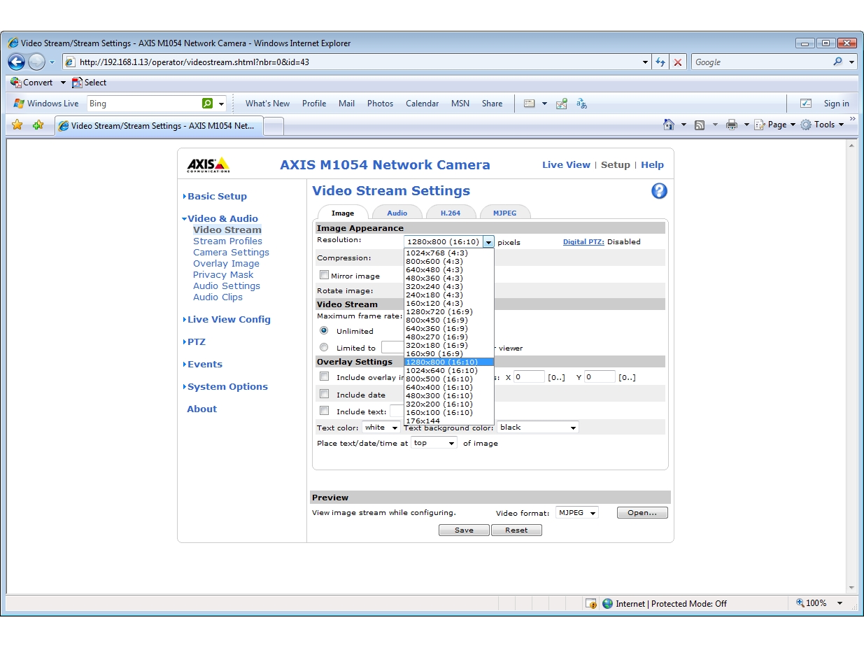 You can swap between M-JPEG and H.264 directly from the live view, and in our review of the Axis P3301 we found H.264 has a significantly lower network bandwidth usage than M-JPEG. Stream profiles are used to group settings such as resolution, encoding and audio together, and these are accessed from the live view.