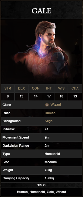 This human wizard has a penchant for arrogance. Operating with only a staff in hand, you’ll find Gale in Act One of the game just after the Roadside Cliff Waypoint toward the northeastern side of the shipwreck. You’ll notice a bright purple light, and getting close to it will trigger an interaction with Gale. He’ll be stuck inside a raging portal.