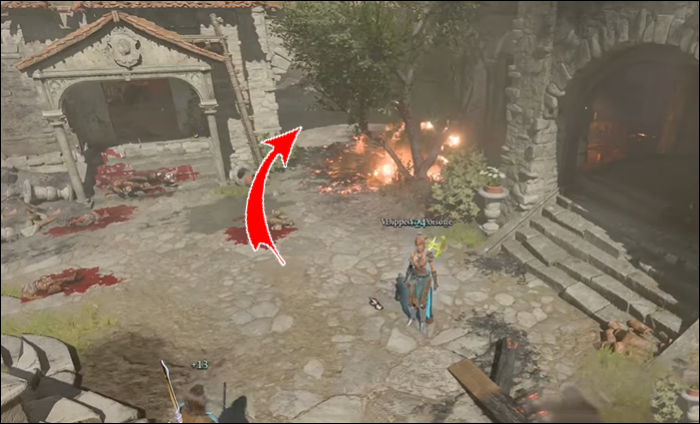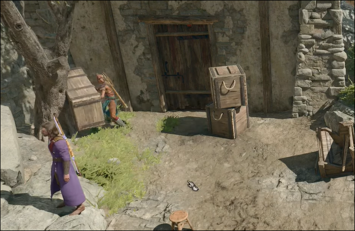 - Head left around the burning inn to find another little shed-like building with a door that has been blocked with crates.
