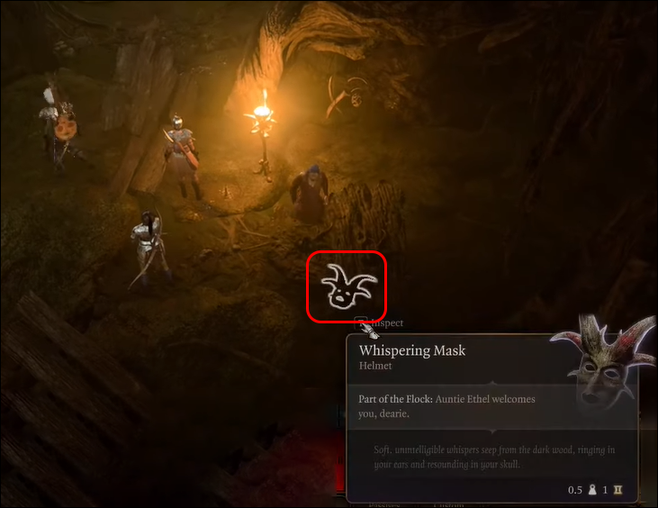 - Head through, down the stairs, and grab a Whispering Mask from the table, but don’t put it on.