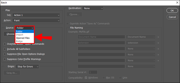 - Under “Source,” select “Opened files” if you opened all the photos you want to batch edit in Photoshop. Otherwise, select “Folder” if you have all the images you want to batch edit stored in a specific folder on your computer.