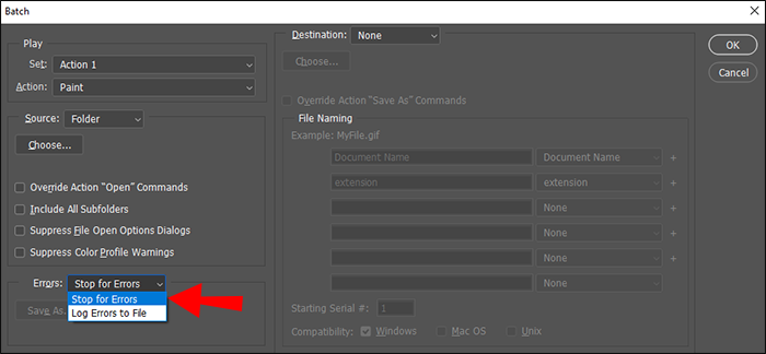- Under the “Errors” dropdown menu, choose “Stop for errors.”