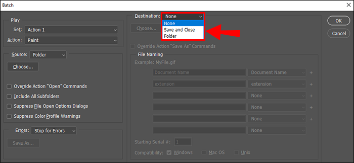 - Specify the destination of the final photos by opening the “Destination” dropdown menu, then choosing “Folder” and specify the folder where you want the final images saved. Alternatively, you can also select “Save and Close.” Photoshop will automatically save your photos when you close the app.