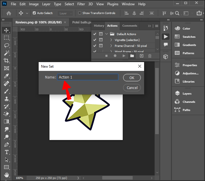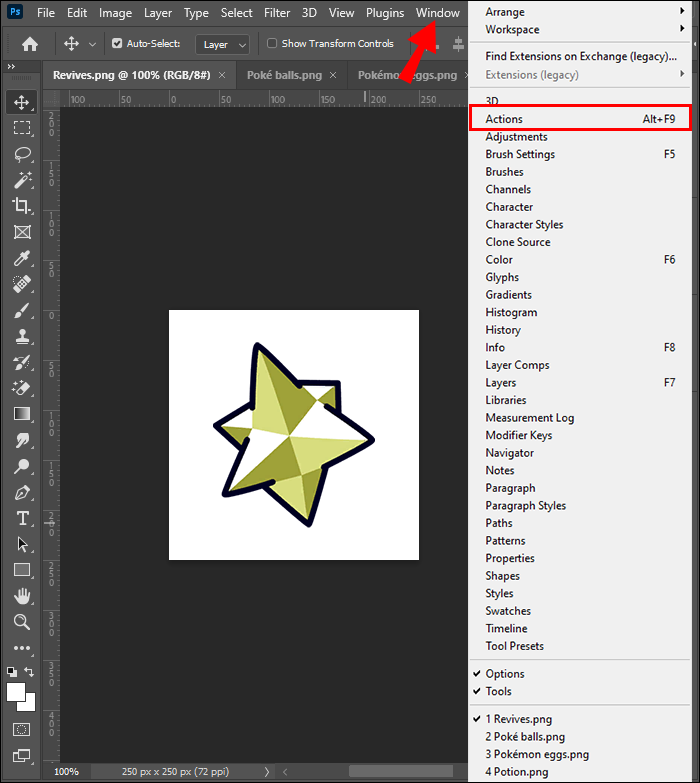 - Open the Action Panel by going to “Window” then “Actions.”