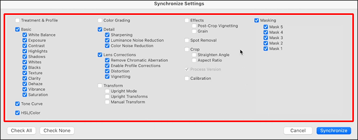 You can use this method to rapidly apply the same edits you applied to one photo to multiple ones at the same time. A sync option is an excellent tool for implementing specific presets and not wasting time editing images one by one.