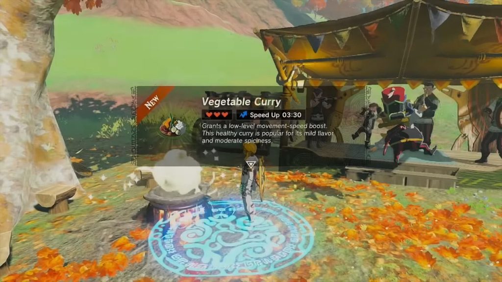qBy adding a carrot (sold in Hateno Village), you can get a haste effect, which allows you to move faster across the world. If you mix a pumpkin (also in Hateno Village) with your curry, Link will be granted a bonus to his defense.