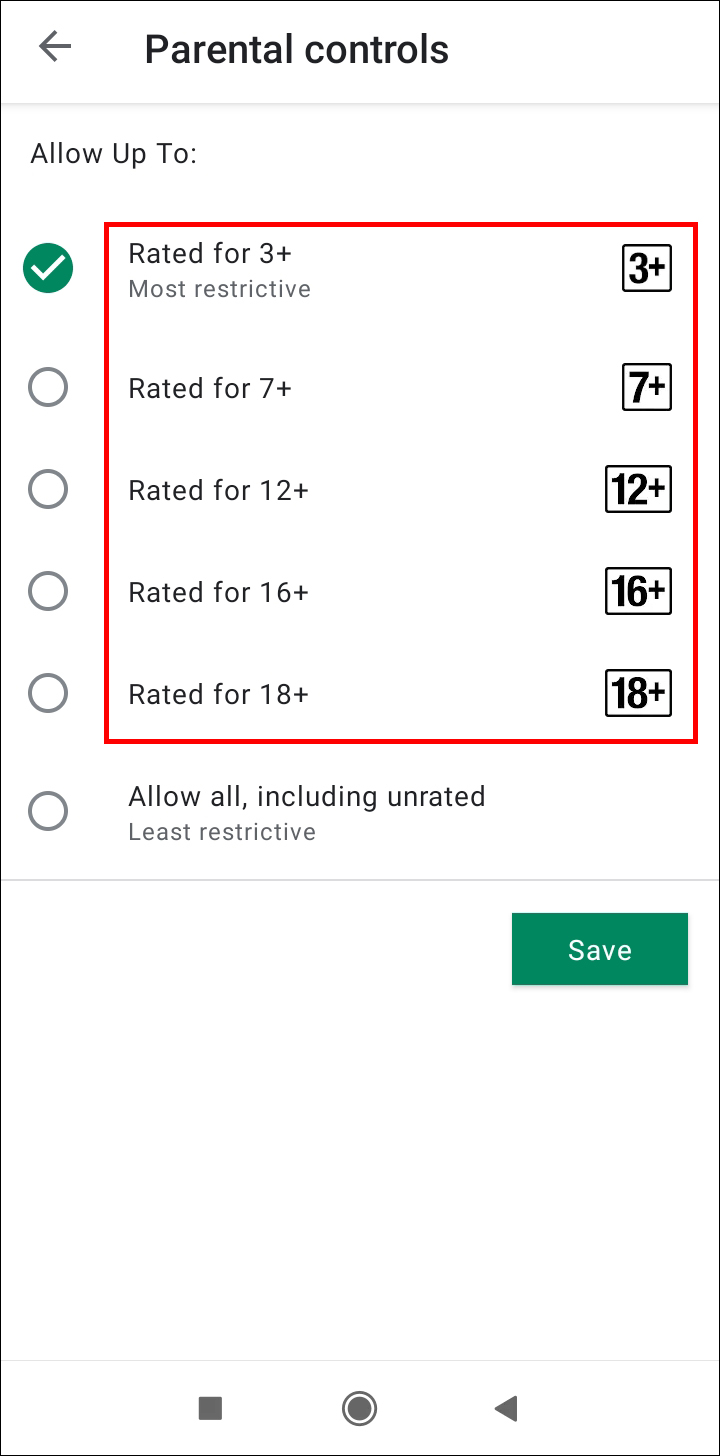 - Select the appropriate age limit. Example: Selecting Everyone 10+ allows apps to install that go up to the Teen rating but doesn’t include apps rated teen and up.