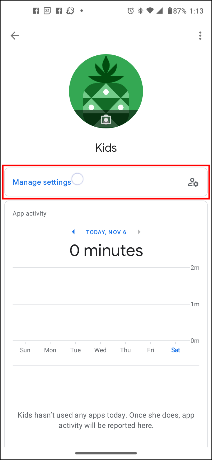- In your child’s profile, tap on Manage settings towards the top if it appears, and then skip to Step 8. Otherwise, continue to Step 7.