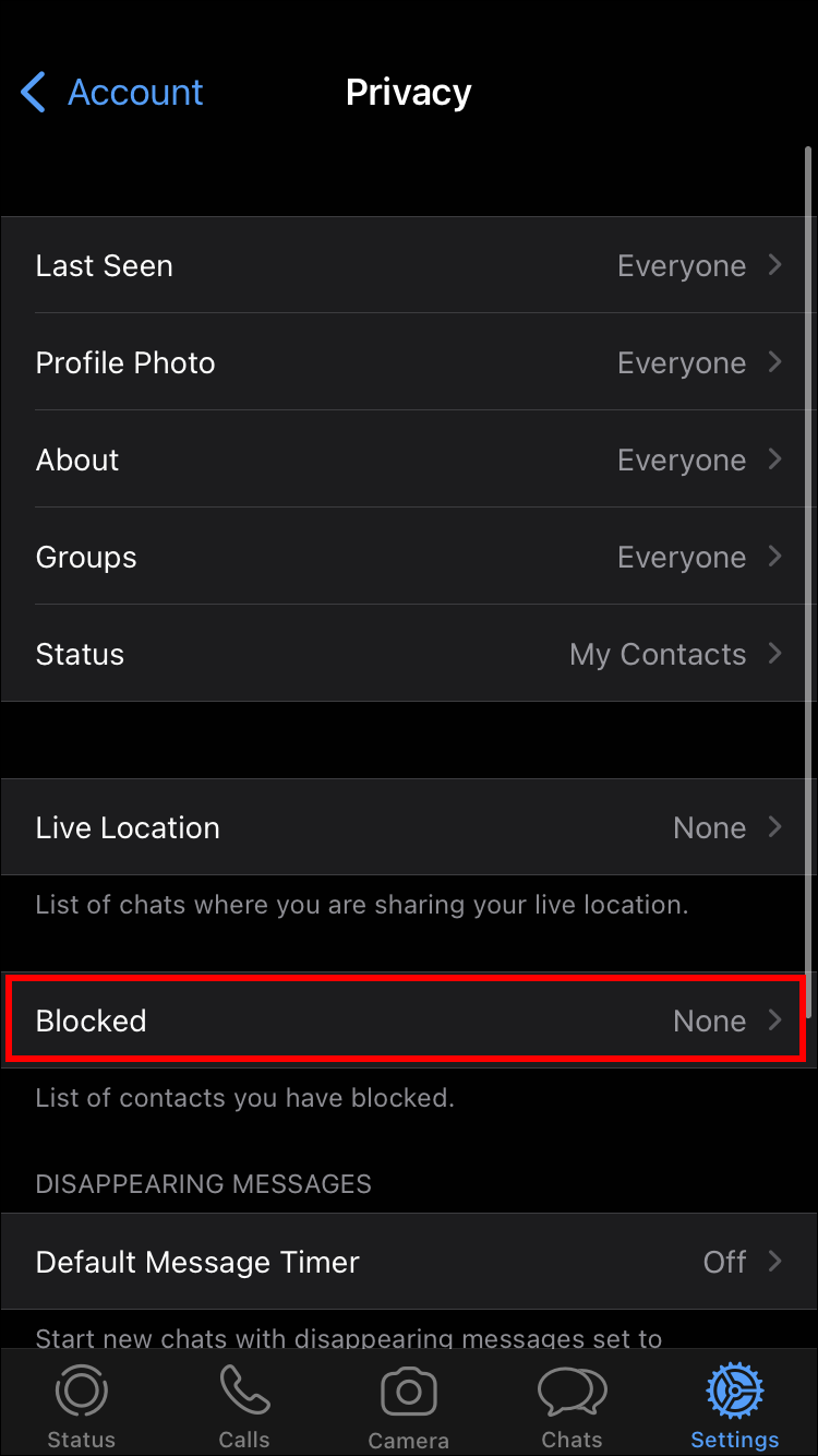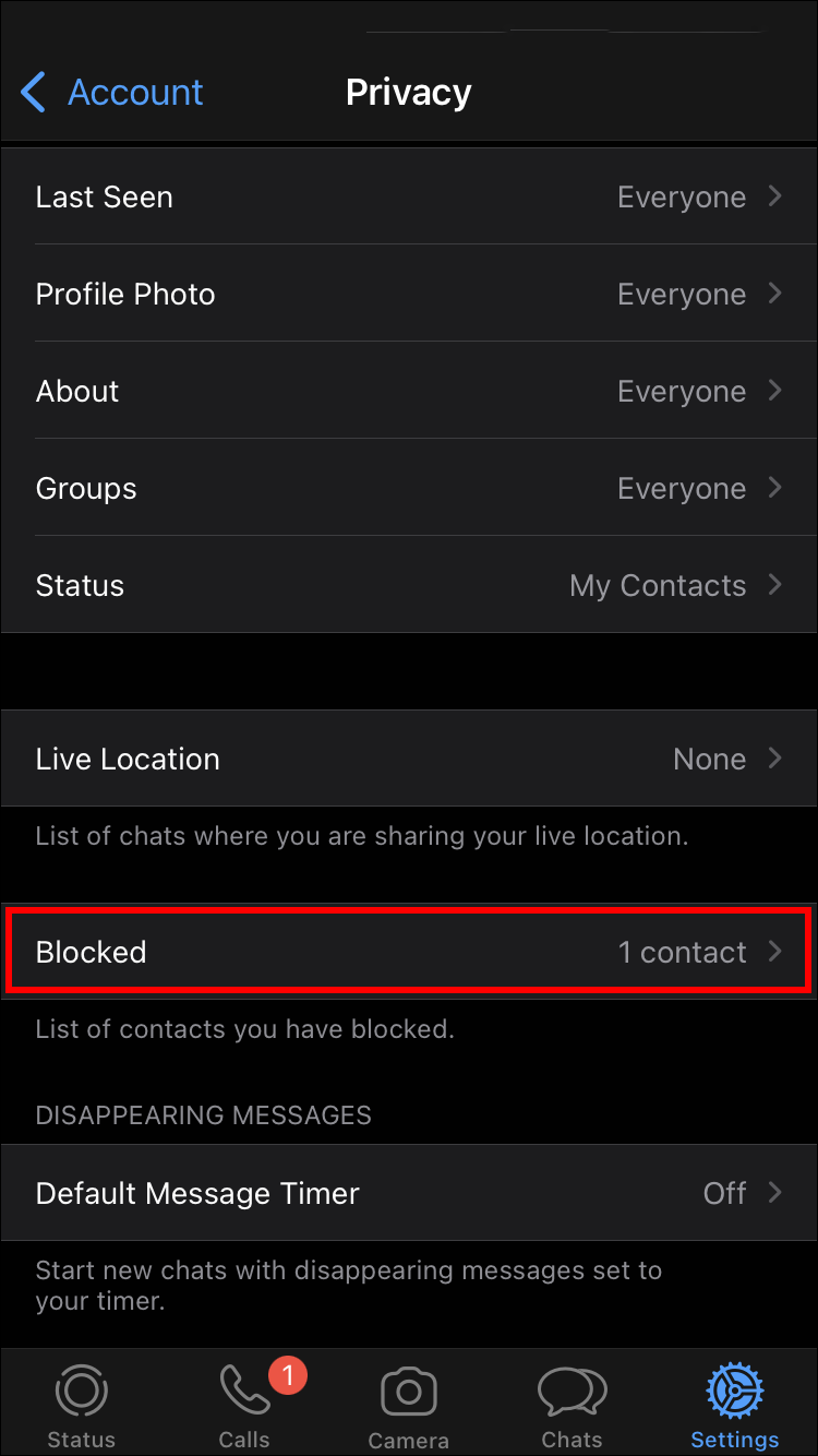 - Select “Account” in the Settings menu. Select “Privacy,” followed by “Blocked contacts.”