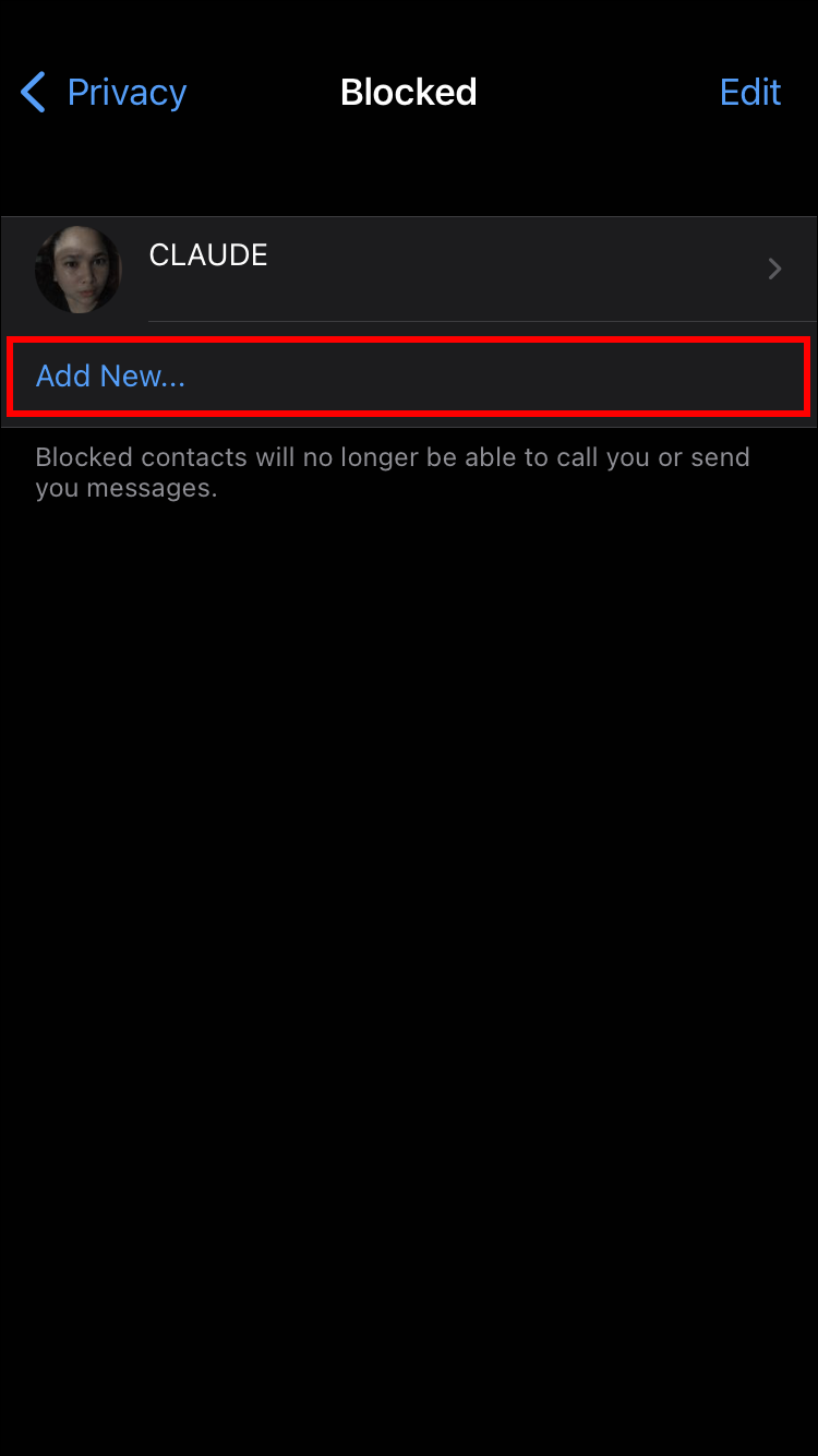 - Select “Add New…” from the Blocked menu and enter the name of the person you want to block.