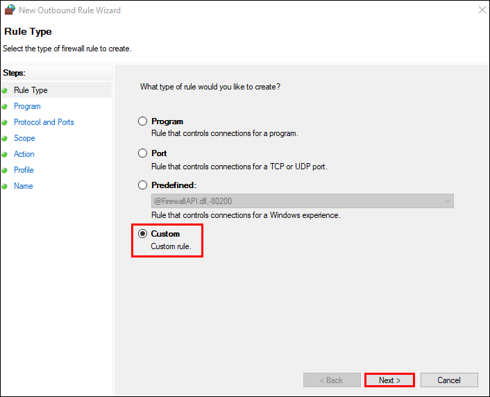 - When a new window pops up, select the “Custom” option followed by “Next.”