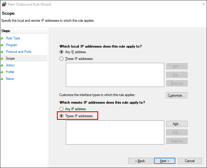 - Select the ” These IP addresses ” option under “Which remote IP addresses does this rule apply to?”