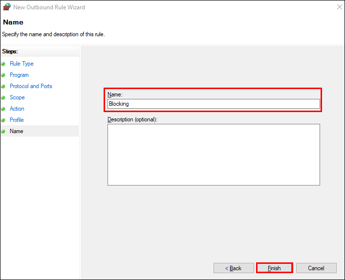 - Select “Next,” add a name or description for this rule, and select “Finish” to complete the action.