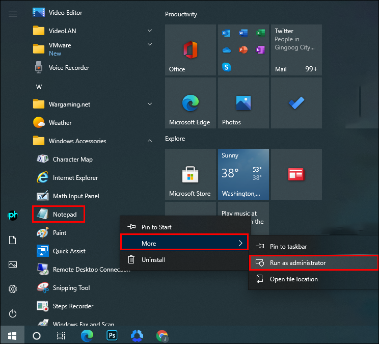 - Right-click on Notepad, select “More” followed by “Run as administrator.”