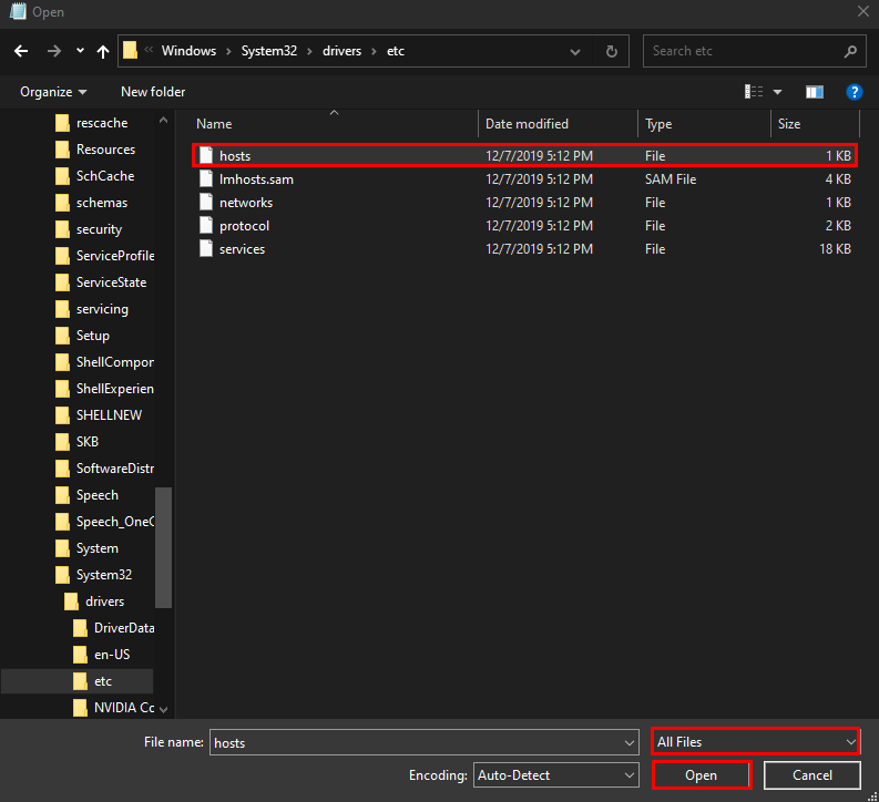 - Make sure to select the “All files” option for the files to appear. Then open the “host” file.