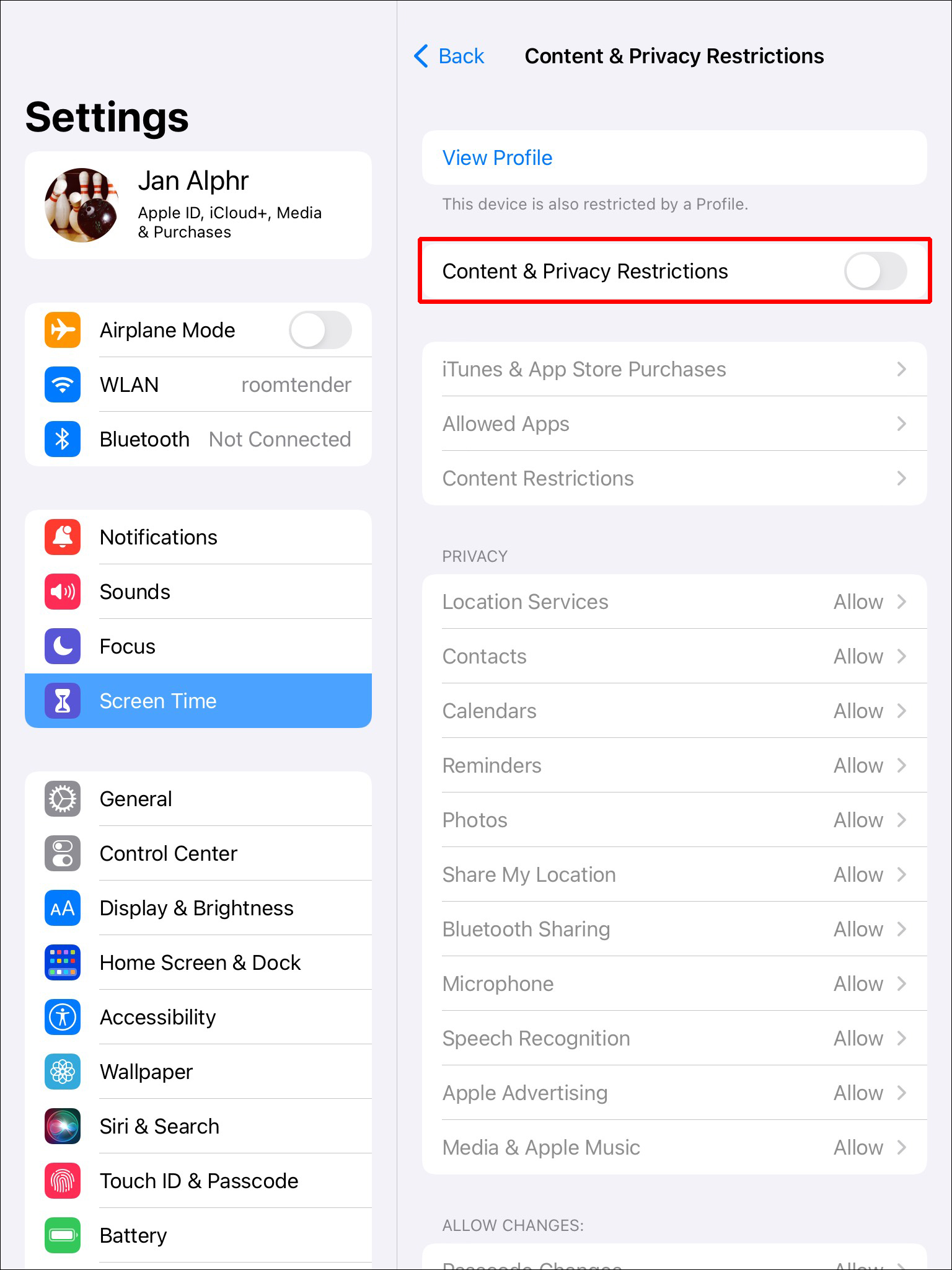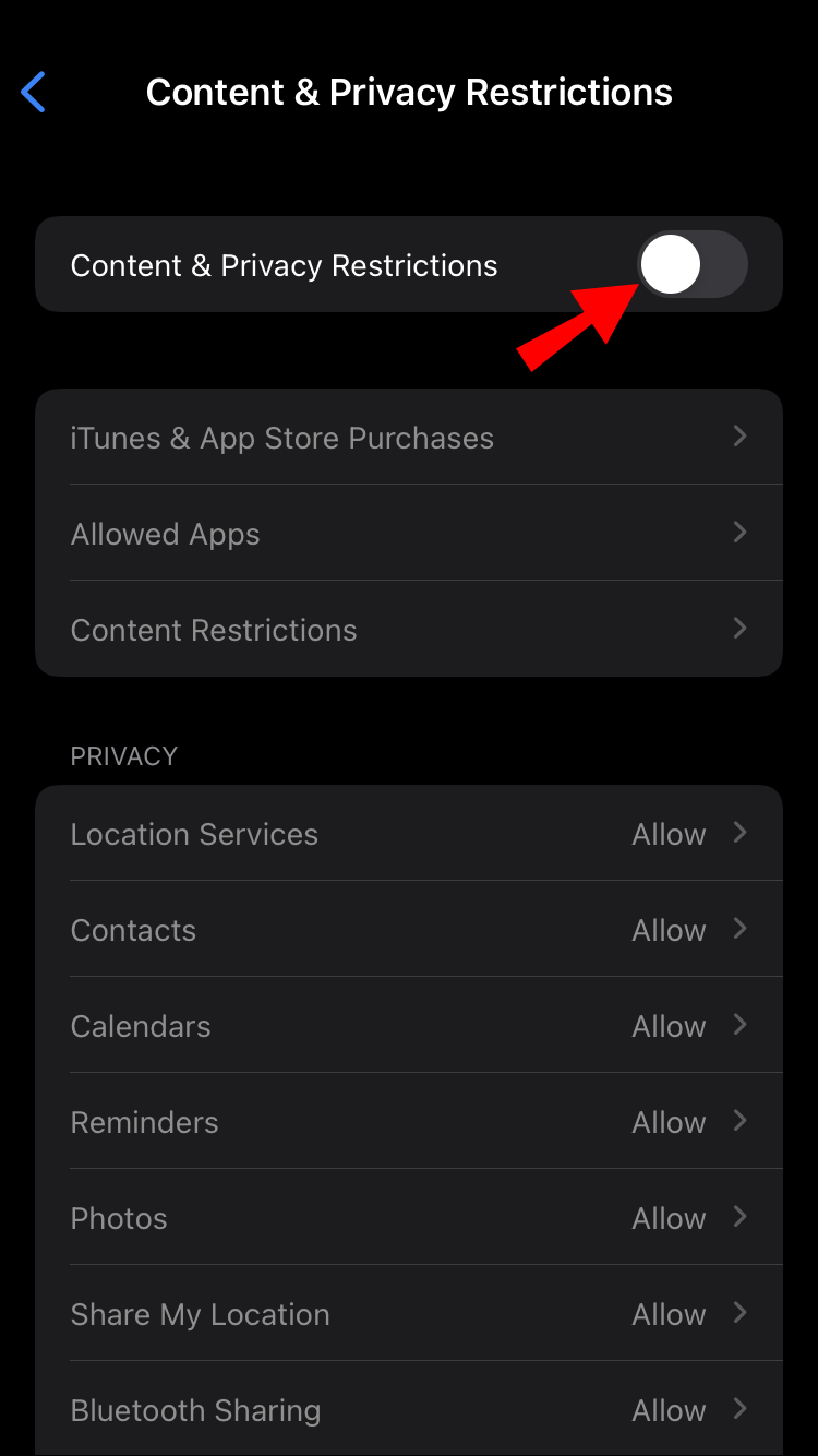 - Toggle the “Content & Privacy Restrictions” slider to the ON position.