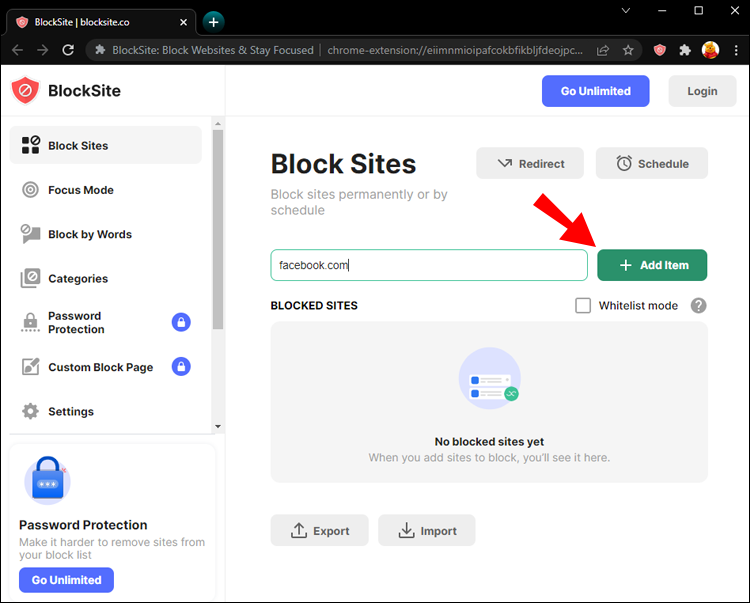 - Go to the left side of the Block Site page and tap “Password Protection.”